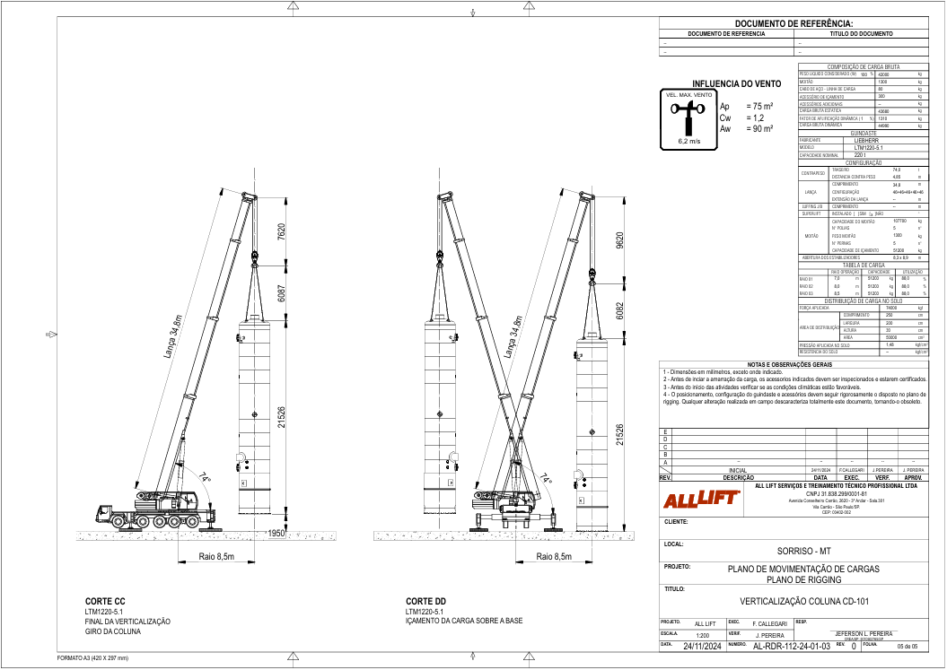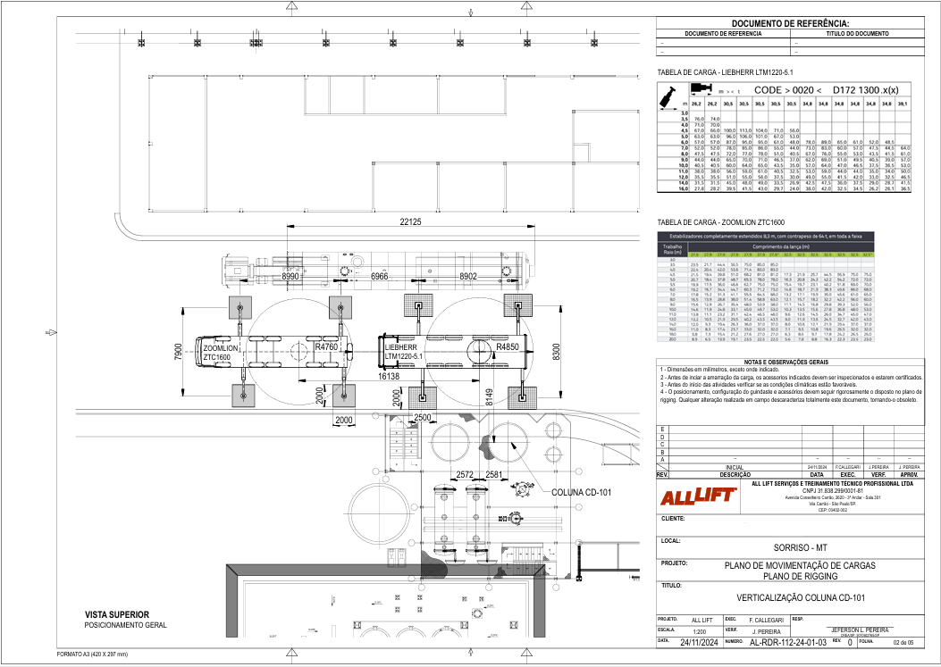 Equipamentos Utilizados: LIEBHERR LTM 1220-5.2 – Marcon / ZOOMLION ZTC1600 – Sorrimetal