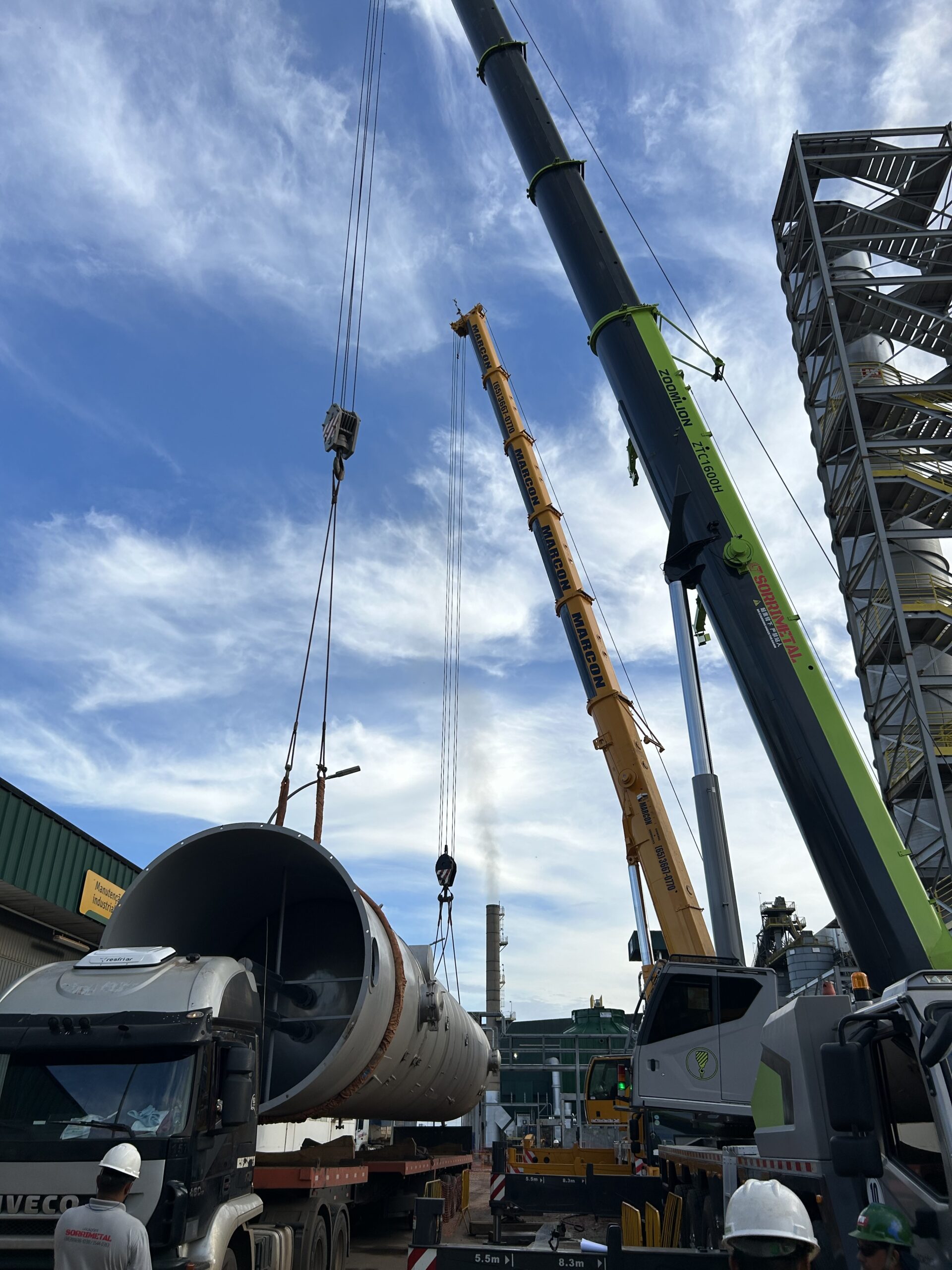 · Coordenação dos equipamentos de elevação, com utilização de dois guindastes telescópicos — um com capacidade de 220 toneladas e outro de 160 toneladas.